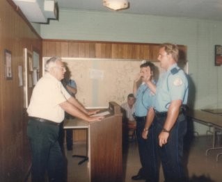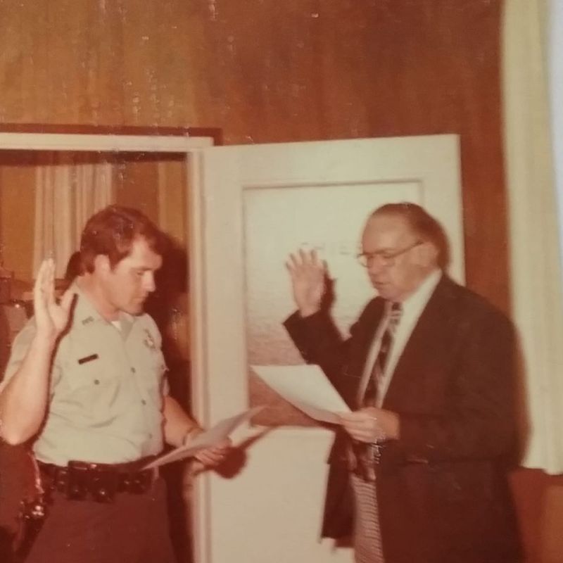 Lamar Pate being sworn in by Chief James DavisSwearing in ceremony of Brooks Sanderson, Gary Cutler, Amos Cross, and another officer by Chief James DavisChief Davis administering the oath of office to Joe Spirakis and Steve TaylorChief Louis Goss swearing in Pete Parkins and Jeff VanCampLisa Broxson and three other officers being sworn in by Chief Louis GossChief Goss administering the oath to two officers with Sgt. Rick Buddin looking on. The officer on the right is E.J. Caddell